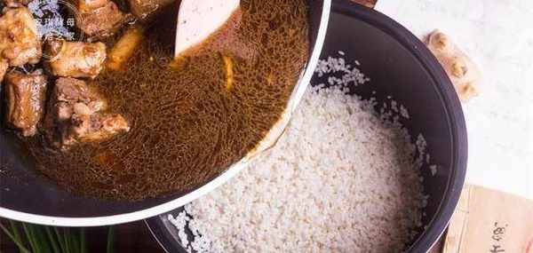 將泡好的大米倒入電飯煲,將排骨和湯汁一起倒入,湯汁淹沒過大米一指節(和平時用水煮飯時一樣),煮熟。