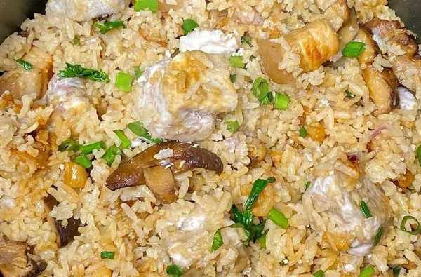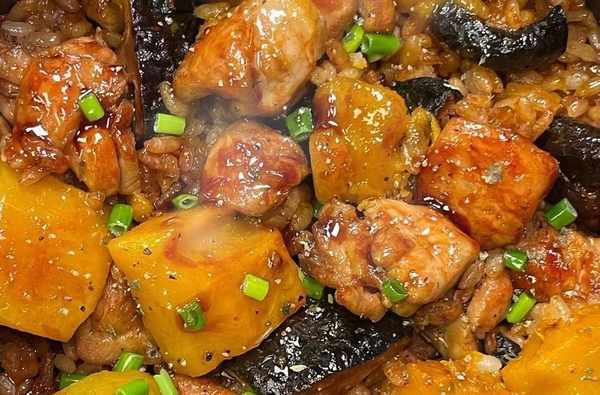 1、大米淘洗幹凈備用。土豆去皮洗凈後切成塊。雞肉清洗幹凈切成塊,擦幹水分後加入料酒、生抽、蠔油、老抽和食鹽,抓拌均勻醃制半個小時。幹香菇泡發洗凈後切成片。