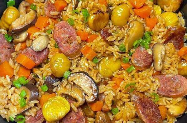 1、板栗可以直接買板栗仁,直接清洗幹凈即可。臘腸清洗幹凈切成薄片,胡蘿卜去皮洗凈後切成丁,香菇清洗幹凈切成片。大米淘洗幹凈備用。