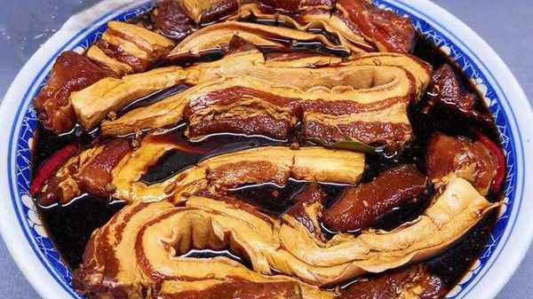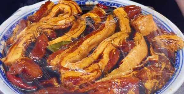 第六步:料汁放涼之後倒入到第三步準備好的五花肉中(料汁要沒過豬肉),再上手抓拌均勻,讓所有的豬肉上面都沾裹上料汁,蓋上保鮮膜密封好,放進冰箱或者是陰涼的地方,醃制上兩天兩夜。