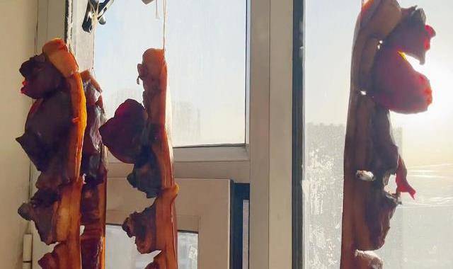 第八步:醃制好的五花肉控幹料汁,放在案板上,分別用繩子拴起來,掛在太陽直射的地方,曬三天左右把豬肉表面的醬油都充分曬幹。