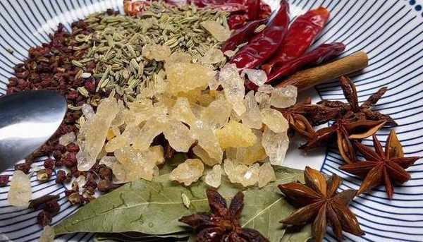 第四步:接下來準備所需的香料:香葉8片、八角8顆、桂皮一小節、丁香9粒、幹辣椒10個、花椒25克、小茴香20克、黃冰糖40克裝在盤子裡。