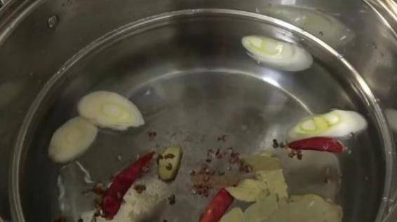 其實趁著晾曬的時間,我們這個時候是可以在鍋裡邊燒一些水,在鍋裡面放入一些蔥薑蒜,同樣也是可以放入一些幹辣椒的,再放入一些花椒和香葉和嚴,但是也一定要多放一些一大鍋的水,大概需要放一大勺的鹽,也就是我們平常時候盛湯用的勺子把這個水都燒開之後,然後這個時候千萬不要把雞蛋放進去煮,一定要等水燒開之後把這些水自然放涼。