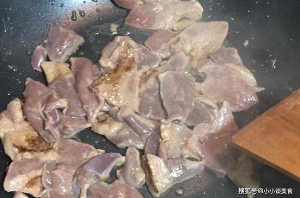 第六步:然後倒入醃制好的豬肝,炒至豬肝變色,倒入適量生抽,翻炒均勻。