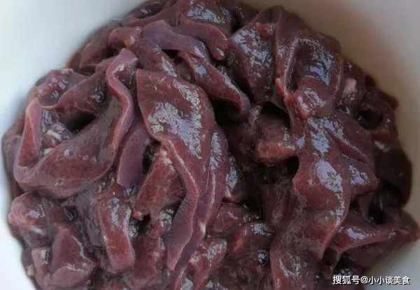 第三步:將豬肝片放入碗中,倒入適量清水,稍微揉搓一下,再用清水漂洗幾遍,最後瀝幹水分備用。