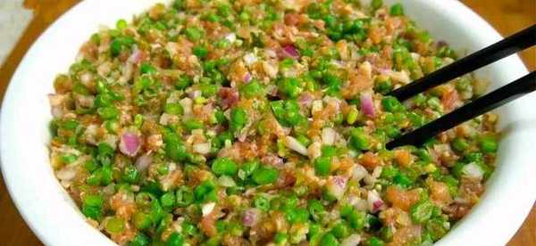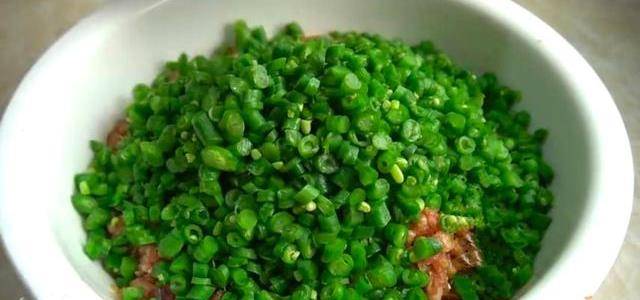 3、長豆角切成小丁,切好以後和醃制好的肉餡裝一塊,再來一點洋蔥丁。也盛到調餡的大碗裡,鍋熱以後加入一大勺食用油,油熱下入四克花椒,三克八角,兩克小茴香,炸出香味,再把熱油澆在的洋蔥上,攪拌均勻,餡料就調好瞭。
