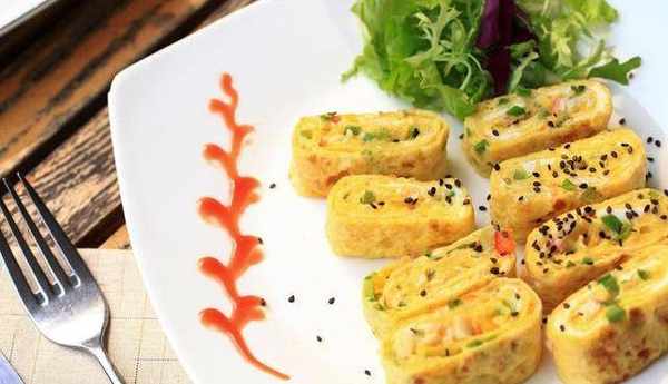 然後將蛋皮卷換到電餅鍋中,然後開小火給它煎兩分鐘。把兩面都煎制焦黃,然後用刀把它切成小段,這樣方便實用。蛋皮卷就做好瞭!