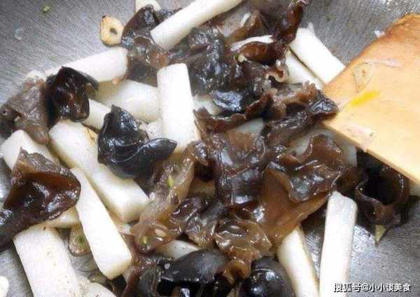 第五步:然後將香菇瀝幹水分,倒入適量清水炒至山藥爛熟。