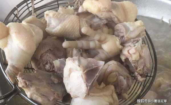 第三步:鍋內加入冷水,放入雞塊,大火煮至泡沫和血水沸騰,撈出雞塊瀝幹水分待用。