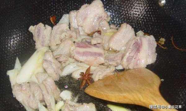 第3步;然後倒入豬肉,翻炒至豬肉變色,倒入適量醬油翻炒至變色。