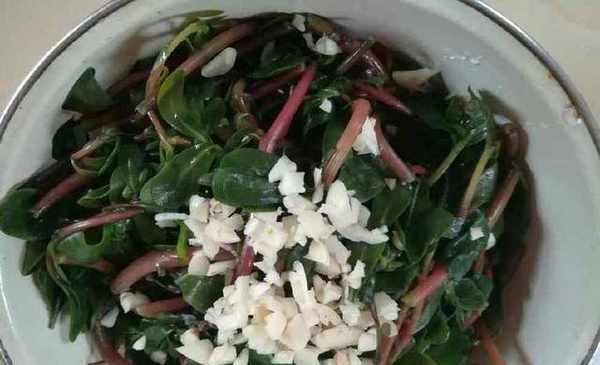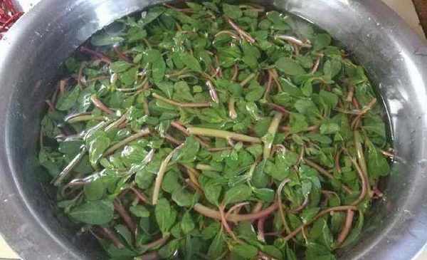 準備好食材後,我們要做的就是清洗馬齒莧瞭。我們先把馬齒莧摘下來,也就是去掉老葉,然後放入清水中洗凈備用。馬齒莧洗凈後,我們將鍋燒熱,在鍋中倒入適量的水。當水沸騰時,我們倒入馬齒莧。倒入後,用勺子快速攪拌,然後關火。關火後,切勿急於將馬齒莧撈出。我們將馬齒莧放入熱水中約兩分鐘。浸泡後,我們將其撈出瀝幹備用。
