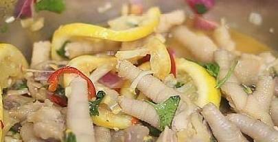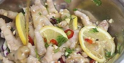 準備材料:鳳爪500克、百香果2個、檸檬、生薑、大蒜、香菜、洋蔥、青椒、紅辣椒、料酒、糖、生抽、白米醋。