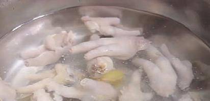開火,鍋內水燒開,放入雞爪和薑片,水燒開後,煮10分鐘,完全燒開後撈出,過涼水備用。