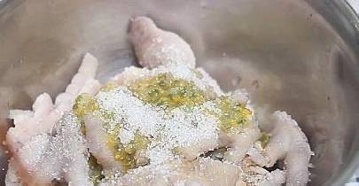 將煮好的鳳爪加入百香果、生抽、白米醋和糖,攪拌均勻。