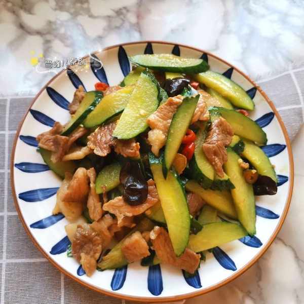 肉片炒黃瓜做法:1,五花肉切片,黃瓜切片,葱薑改刀。2,鍋裏放入花生油,入葱炒香,倒入五花肉煸炒出油。3,烹入一勺生抽炒勻,這時倒入黃瓜片炒勻,加鹽調味即成。4,出鍋前再放幾個紅椒圈點綴。