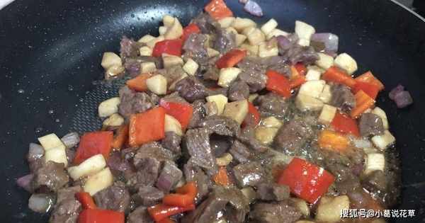 第五步,然後加入牛肉塊一起翻炒,然後下調料,加少許黑胡椒粉、鹽和雞精調味,拌勻,加入紅辣椒翻炒片刻,關火加熱並離開鍋。