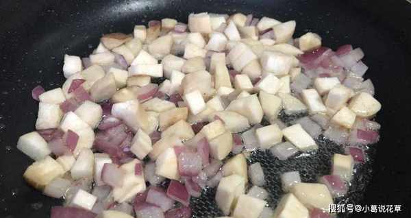 第四步,鍋中倒入少許油,加入洋蔥炒至變色,然後加入牡蠣翻炒至軟。