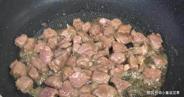 第三步,鍋燒熱,加入牛油融化,然後倒入醃制好的牛肉炒至變色,收起待用。