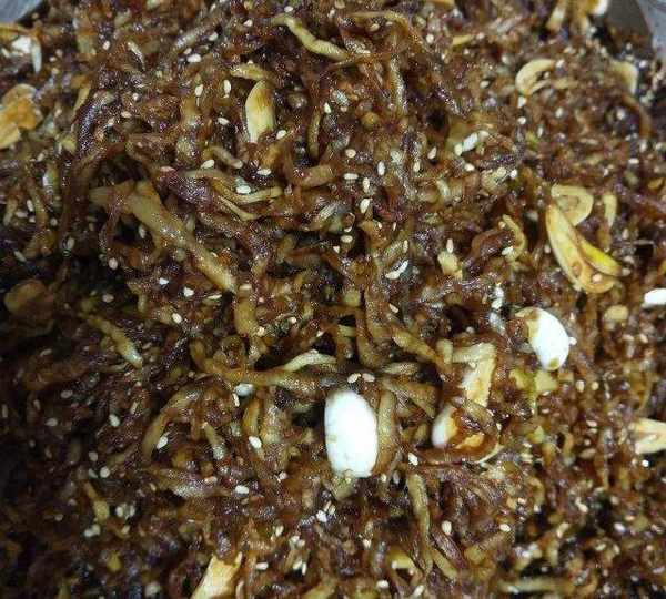 第10步、將調好的料汁倒入壓幹的根絲中。