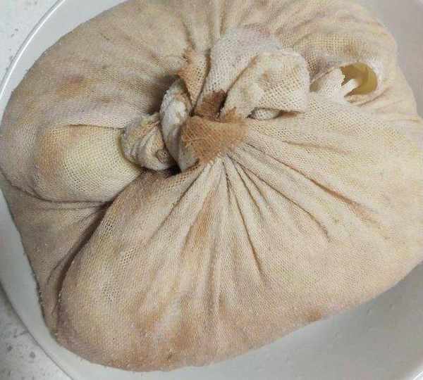 第5步、用籠佈包好,架起來,用重物壓出水份,盡量壓幹。我的籠屜佈上次鄰居聘女兒,幫她蒸糕的時候給燒瞭一個角,不好看瞭