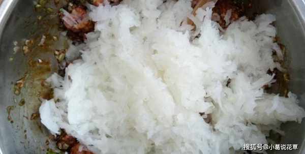 第二步,白蘿卜去皮切碎,加鹽醃制水,然後擠幹水分,放入肉餡中攪拌均勻,一邊用力一邊攪拌,做成餃子餡。