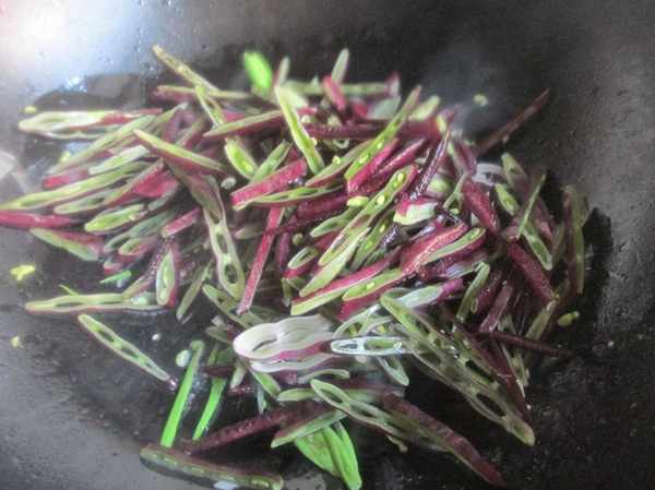 鍋裏放入花生油,放入葱末爆香,倒入切好的扁豆絲煸炒均勻,稍微撒一些水蓋上蓋子讓它充分的熟透。