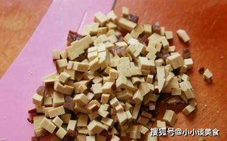 第三步,取適量豆腐幹,切成小塊,三者混合,加入薑末、蠔油、鹽,倒入一勺食油拌勻。
