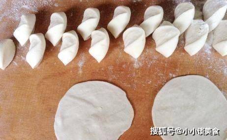 第四步,面粉加少許水,揉成光滑的面團。靜置30分鐘後,轉移到案板上,揉成長條,分成小面條,搟成餃子皮;
