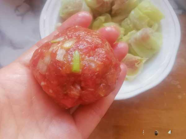 所用資料:肉餡適量,白菜葉適量,葱末,薑末,醬油,胡椒粉,鹽少許,花生油少許,蚝油少許。