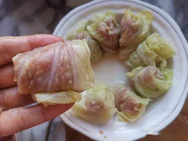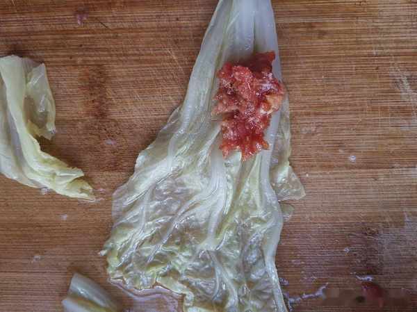 第三步:把白菜鋪開,把肉餡放上,卷起來。