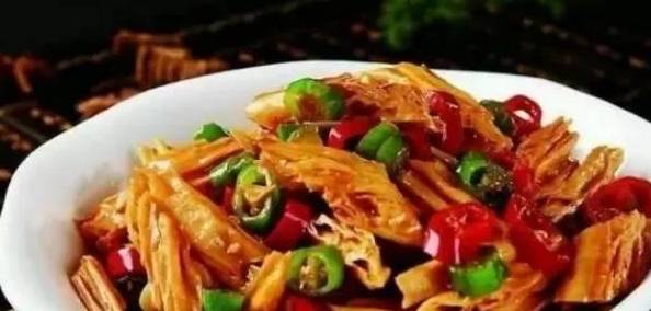 食材:腐竹、紅辣椒、青辣椒、蔥、薑、蒜、老抽、生抽、鹽、糖