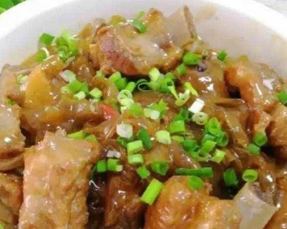 食材:排骨約1000克,寬粉適量,生抽適量,老抽少許,蔥適量,薑適量,八角1個,鹽適量。