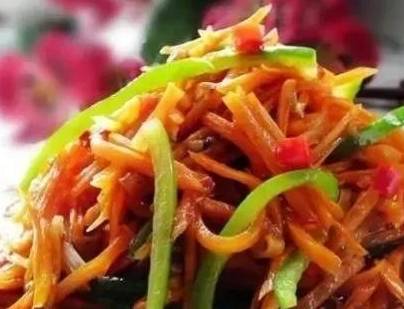 5加入煸炒好的胡蘿卜絲炒勻。再加入青椒絲翻炒均勻即可。