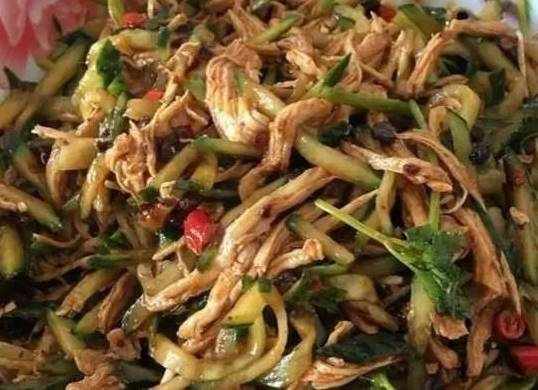 3.黃瓜切絲,紅椒切絲,加雞絲,花椒油,蒜(末),鹽,醋,蠔油,辣椒油拌勻即可