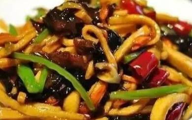 8、下入胡蘿卜絲煸炒。9)放入木耳絲煸炒勻。