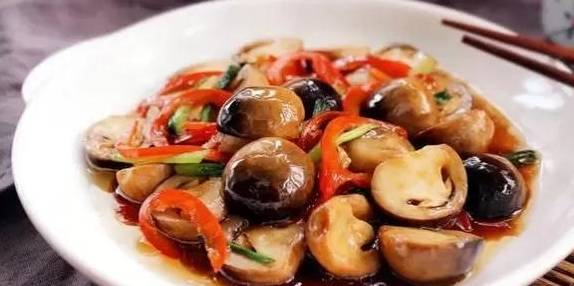 3、待草菇都裹上一層蠔油時,下入紅椒,香蔥,翻兩下,調下適量鹽。出鍋。
