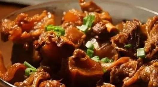 3、鍋放旺火上,放入花生油燒四成熱,下面豉、蒜茸、薑片爆香,加牛腩、烹紹酒,再下深、淺色醬油和白糖、二湯略燜,用濕淀粉打芡裝盤即可。