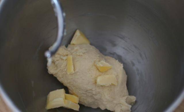 1.將配方中除黃油外的所有材料放入料理機的面團桶中,開始低位揉面,避免幹粉飛濺。當面團形成一個球並略帶筋力時,加入軟化的黃油