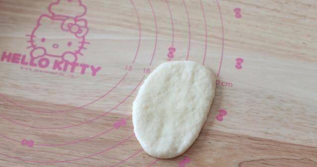 4、面團發酵好後,平均分成9份。將每個小面團揉好,蓋上保鮮膜靜置七八分鐘,然後搟成橢圓形