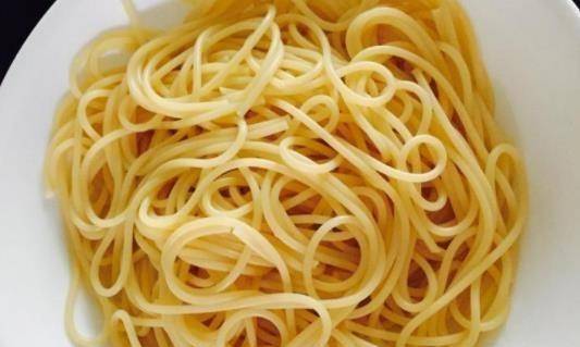 第四步:另外準備一個平底鍋,加入冷水燒開,撒上適量的鹽和橄欖油,倒入意大利面,煮8分鐘,取出裝盤。