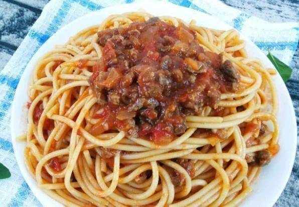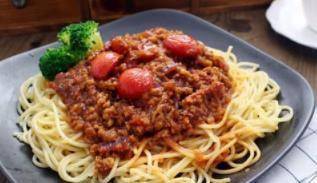 所需食材:碎牛肉、番茄、番茄醬、紅酒、洋蔥、大蒜、意大利香草、胡椒粉、鹽、意大利面、橄欖油