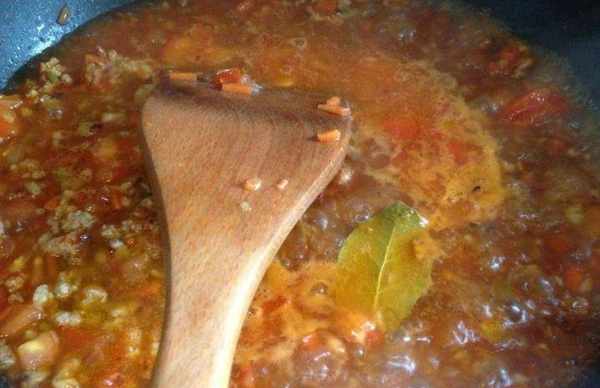 第三步:加入西紅柿、番茄醬、意大利調味料、鹽和胡椒粉,翻炒均勻後轉小火燉15分鐘至湯汁濃稠。