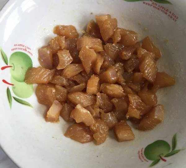 第1步、雞肉切成丁,加入適量鹽,胡椒粉,生抽及食用油醃制十分鐘。