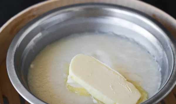 No.4|趁熱加入黃油,黃油融化後戴上隔熱手套用手抓捏至黃油完全融合在糯米團中;
