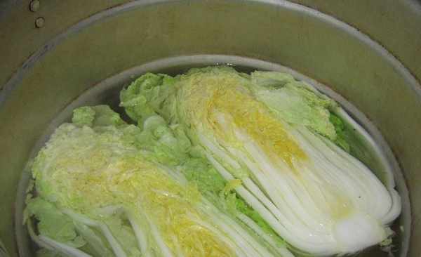 接下來的工作需要很長時間。我們需要準備一個大一點的鍋,最好能一次裝下所有的卷心菜。將菜葉放入鍋中,然後用手抓起鹽,抹在菜葉上。將鹽均勻地撒在葉子上。所有的菜葉都沾上鹽後,靜置醃制30分鐘。周圍,時間到瞭,我們可以看到白菜會沉淀出很多水分。