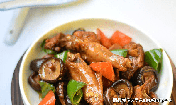 4、倒入泡好的香菇、胡蘿卜,大火翻炒均勻,倒入適量開水沒過食材,煮開後小火燉20分鐘。加入適量食鹽調味,放入青椒塊,大火翻炒收汁,湯汁濃稠即可出鍋。