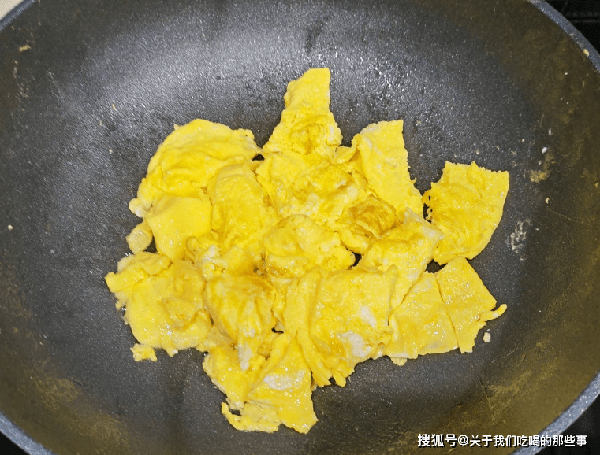 2、鍋裡倒入適量油燒熱,倒入雞蛋液,大火煎一會兒,蛋液凝固後翻個面,煎熟後炒成大塊,盛出備用。鍋裡留底油,放入蔥花爆香,倒入胡蘿卜絲大火翻炒一會兒。