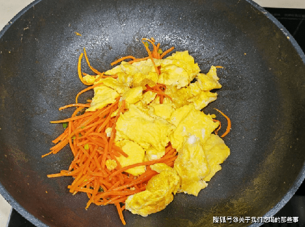 3、胡蘿卜絲變軟後,加入適量食鹽、生抽、蠔油、花椒粉調味,翻炒均勻後倒入雞蛋塊,翻炒均勻即可出鍋。