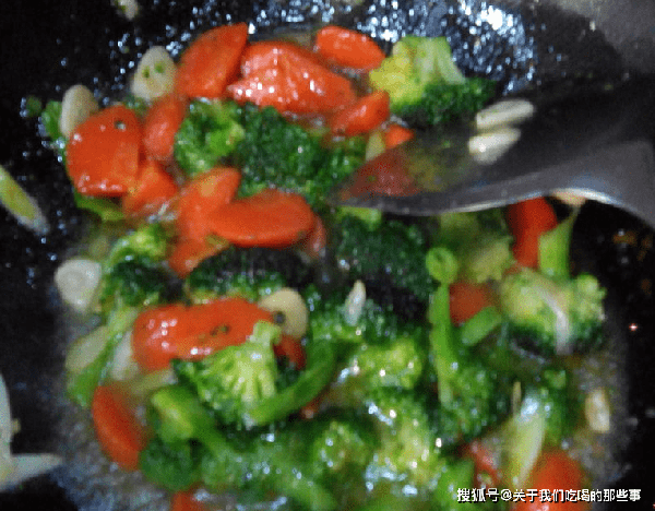 2、蒜瓣切蒜末,大蔥切蔥花,起鍋燒油,放入蒜末蔥花爆香,倒入胡蘿卜塊,中火翻炒一會兒,斷生後倒入焯過水的西藍花,繼續翻炒一會兒。