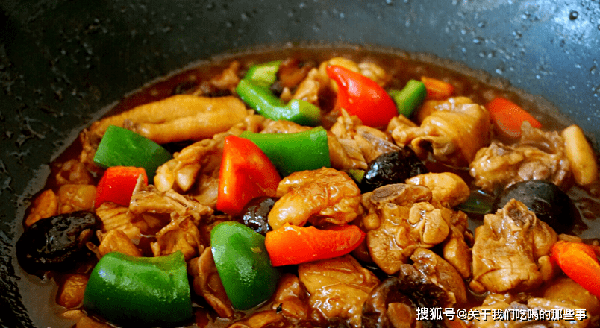 4、土豆、香菇、雞塊都熟透後,轉大火收汁,放入青紅椒塊翻炒,加入適量食鹽調味,翻炒至斷生後即可出鍋。